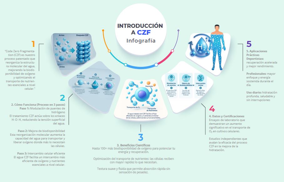 Code Zero Fragmentation (CZF) es nuestro proceso patentado que reorganiza la estructura molecular del agua, mejorando la biodisponibilidad de oxígeno y optimizando el transporte de nutrientes esenciales a nivel celular.